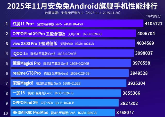 来说全体,兔安卓旗舰手机机能排行榜中正在2025年11月份安兔,X9 Pro卫星通讯版排列第一名和第二名红魔11 Pro+和OPPO Find 。兔平台上正在安兔,105121分和4006704分这两款智内行机的均匀跑分分袂为4。中其,版搭载自研山海通讯巩固芯片与全新天线架构OPPO Find X9 Pro卫星通讯,中可优化收集相联正在信号庞大情况,星通讯才力并具备卫,络笼盖的至极情况以应对无地面网。